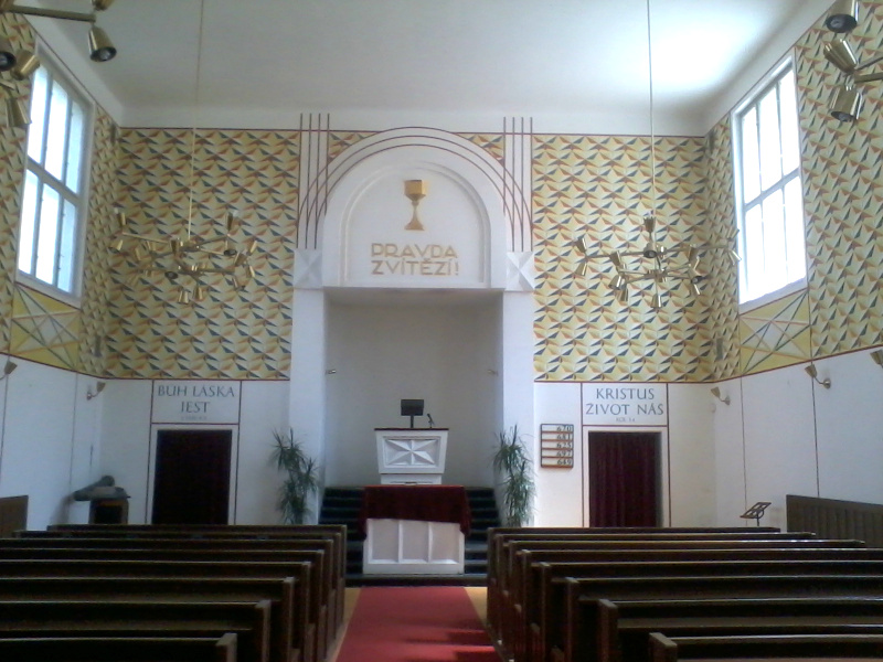 Betlémská kaple na pražském Žižkově. Kazatelna s kubistickou rozetou