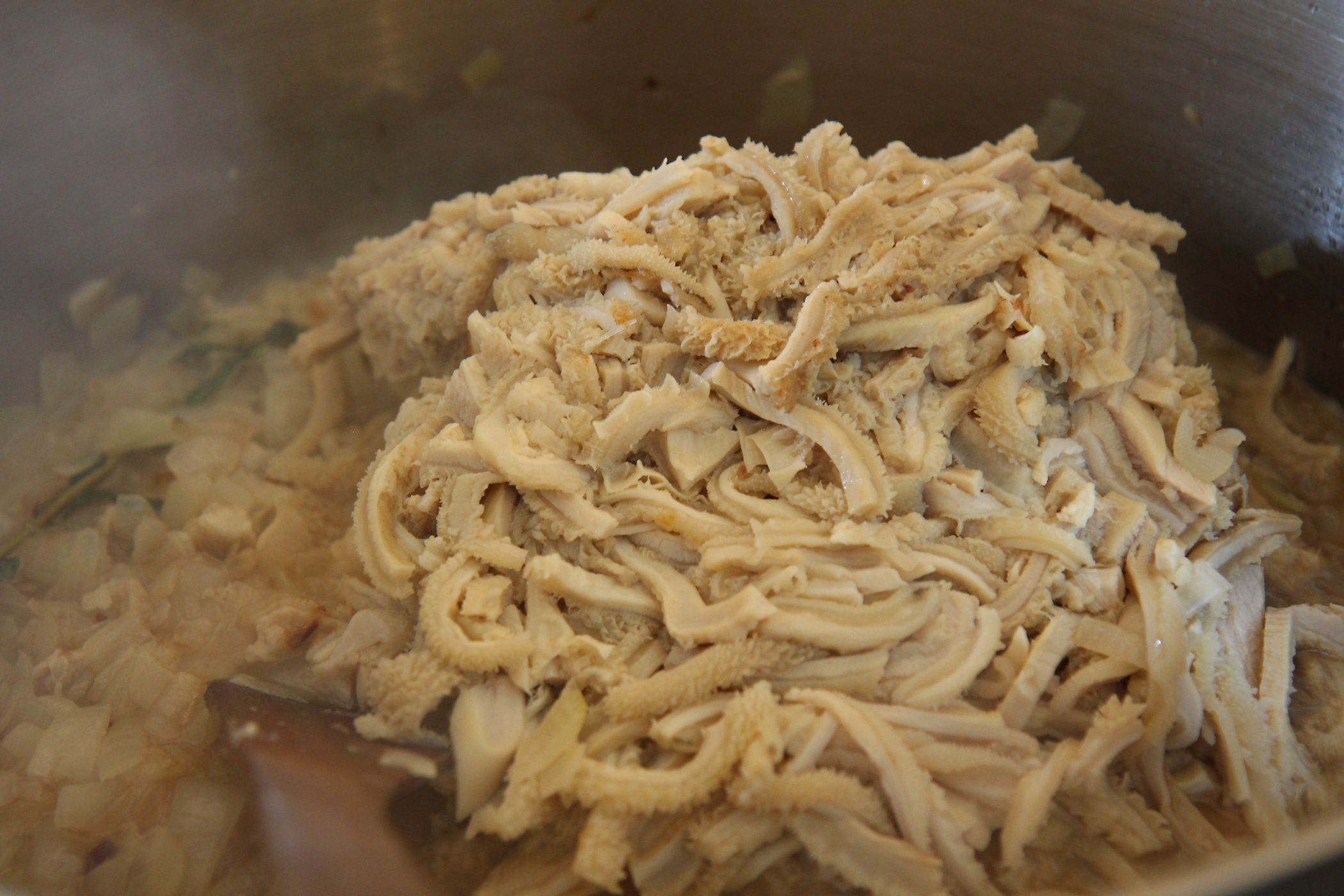 - Jak pustí tuk, přidáme dršťky nakrájené na malé kostičky.