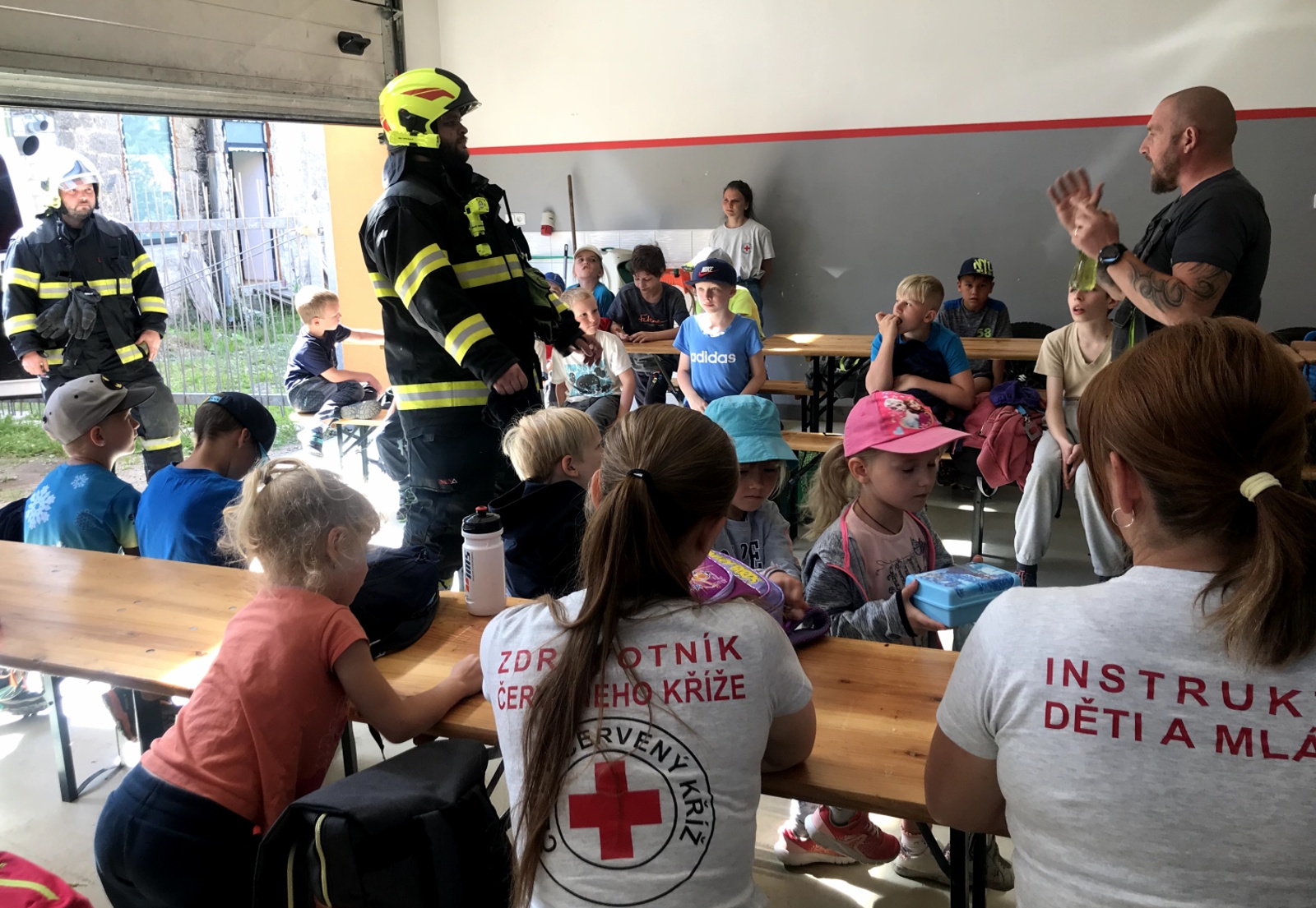 Před tamní hasičskou zbrojnicí si asi třicet dětí mezi pěti až dvanácti lety zvědavě prohlíželo červenou hasičskou cisternu. Hasiči jim také vysvětlovali, jak a co se používá při hašení požáru. Prakticky si práci s hadicí a další požárnickou technikou táborníci vyzkoušeli na nedaleké louce. Tam jim hasiči předvedli ukázku zásahu, a protože má být prezentace pro děti hlavně zábavná, čekaly děti také hrátky s vodou.