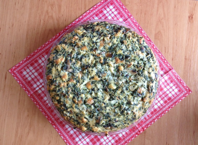 - Pečivo přesuňte do mísy, nechte zchladnout, přidejte mléko, slaninu, cibulky, špenát, petržel (můžete dát i medvědí česnek, mladé kopřivy), sůl, pepř, hrst mandlových lupínků, muškátový oříšek a rozpuštěné máslo.