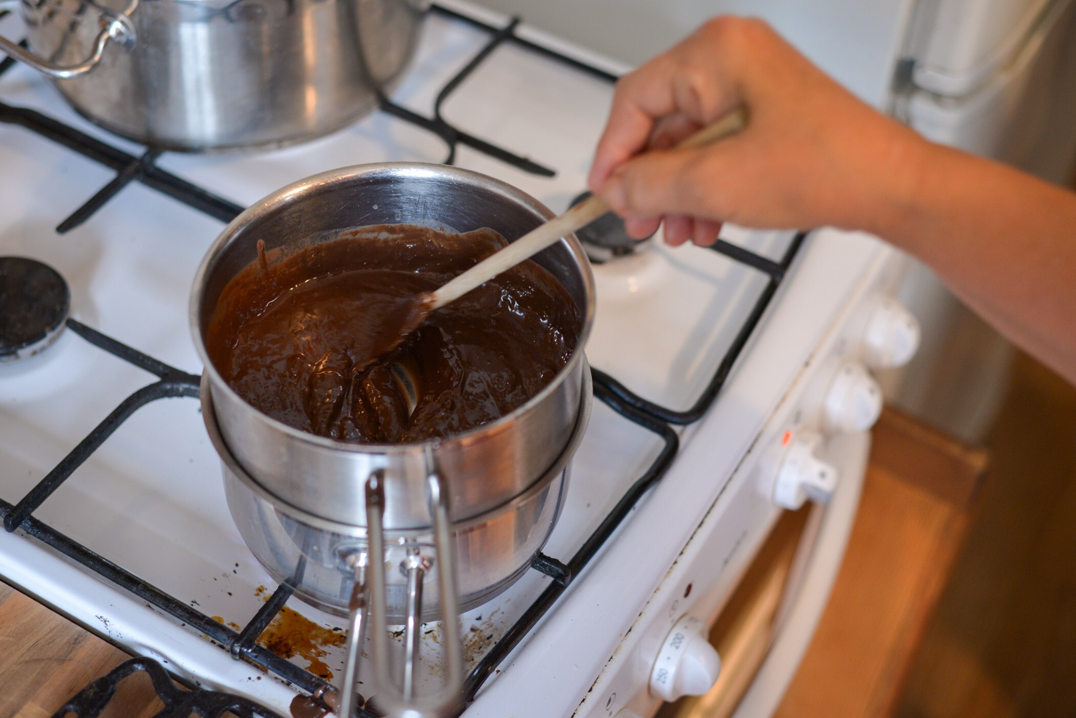 - Po upečení polijeme čokoládovou polevou. Připravíme si ji ve vodní lázni tak, že rozpustíme čokoládu a máslo.