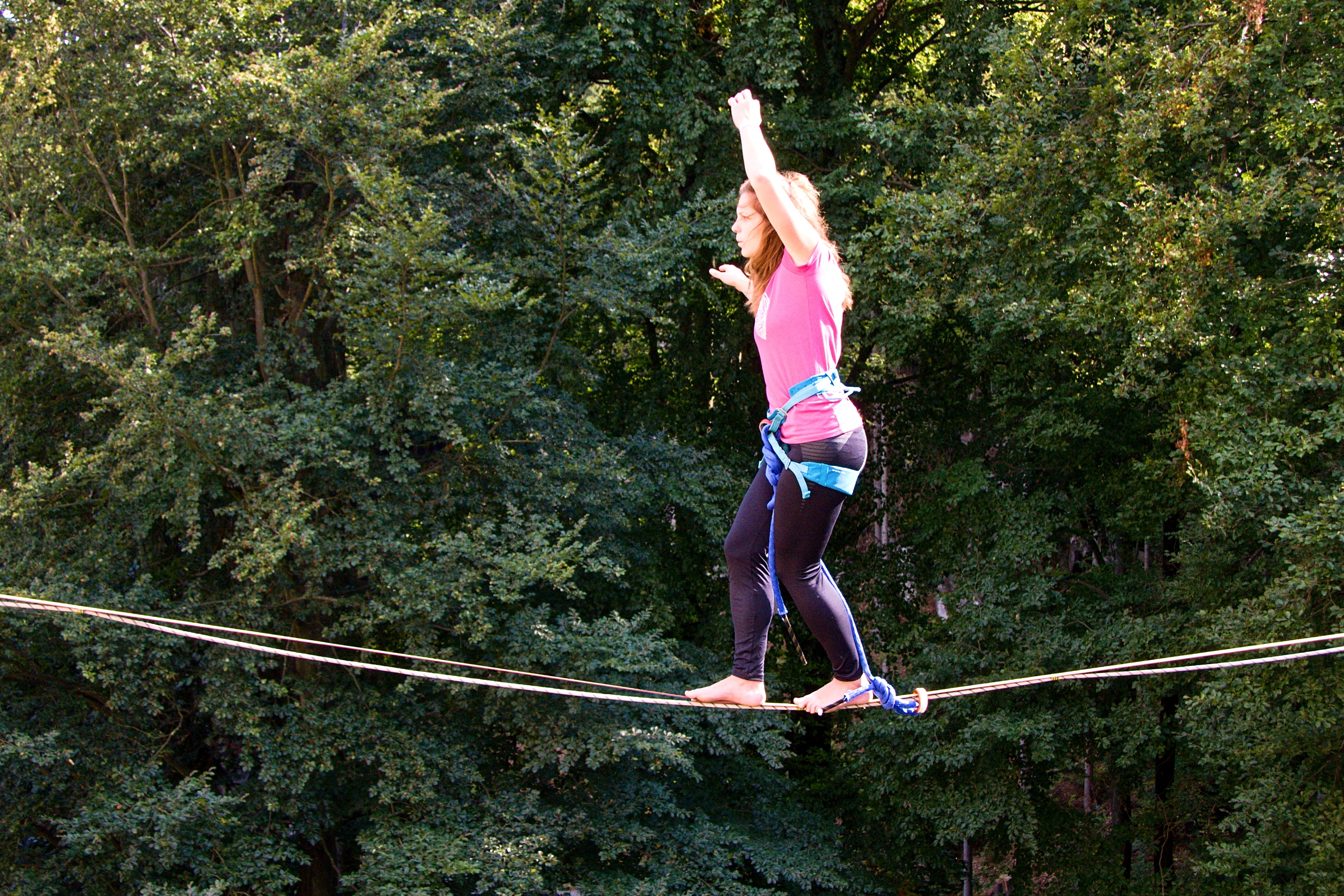 Chůzi po lajně si mohou na terase vyzkoušet i zájemci z řad diváků. Úžasná podívaná a odvážné muže i ženy balancující ve výškách bude v neděli pokračovat až do 16 hodin.