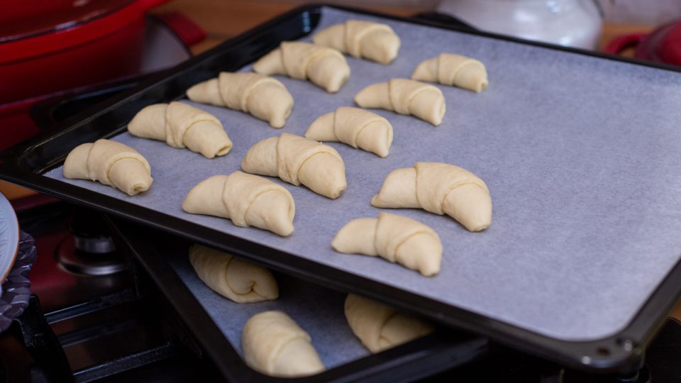 Připravené rohlíčky položíme na plech vyložený pečicím papírem. Trošku při pečení vyběhnou, takže na jeden plech je ideální počet 20 rohlíčků.