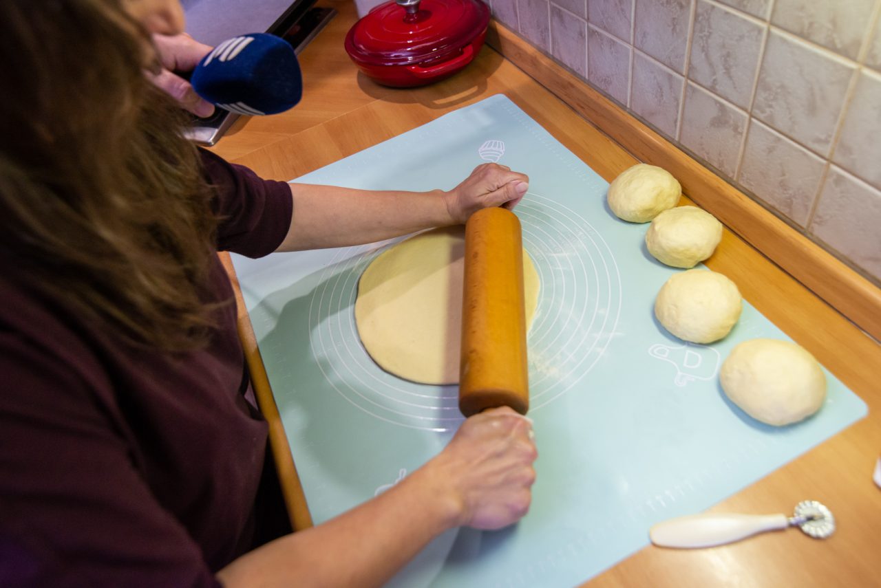 Hotové těsto nekyne, ale rovnou ho překlopíme na pomoučený vál, uhněteme do bochánku a rozdělíme na pět stejných dílů. Z každého zakulaceného dílu rozválíme placku o průměru 25 cm. Pak ji rádýlkem rozdělíme na osm stejných výsečí. Z jednoho bochánku budeme mít 8 rohlíčků.