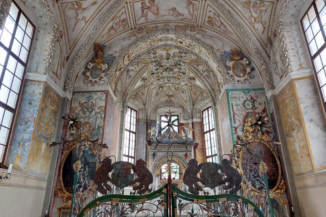Italská renesance ve své nejzdobnější podobě je k vidění v zámecké kapli Všech svatých. V jejím středu stojí kamenný katafalk se štukovými plastikami ležícího Zachariáše z Hradce a Kateřiny z Valdštejna. „Pod katafalkem se nachází krypta, v níž jsou cínové rakve,“ dodává kastelán. Uměleckým dílem je i oltář s baldachýnem. „Na sever od Alp budete hledat jen stěží prostory, které jsou takovým způsobem vyzdobené.“
