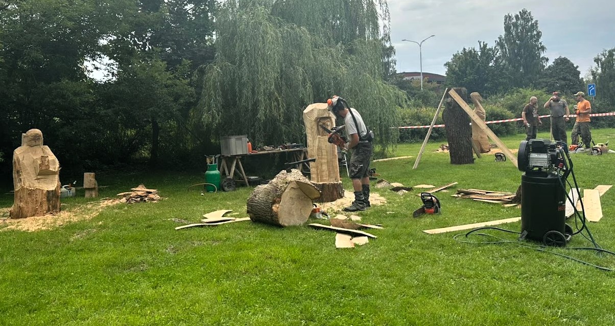 Na svých dílech pracovali celý den a návštěvníci je mohli pozorovat při práci. S řezbářem motorovou pilou Martinem Kučerou jsme teď v zahradě, kde už další řezbáři začali dřevo opracovávat. „Je to náročný fyzicky, protože pily něco váží a ten kmen sám o sobě také. Hrubý řez trvá okolo tří čtyř hodin a pak následuje detailní práce freskami, dláty,“ popisuje Martin Kučera.
