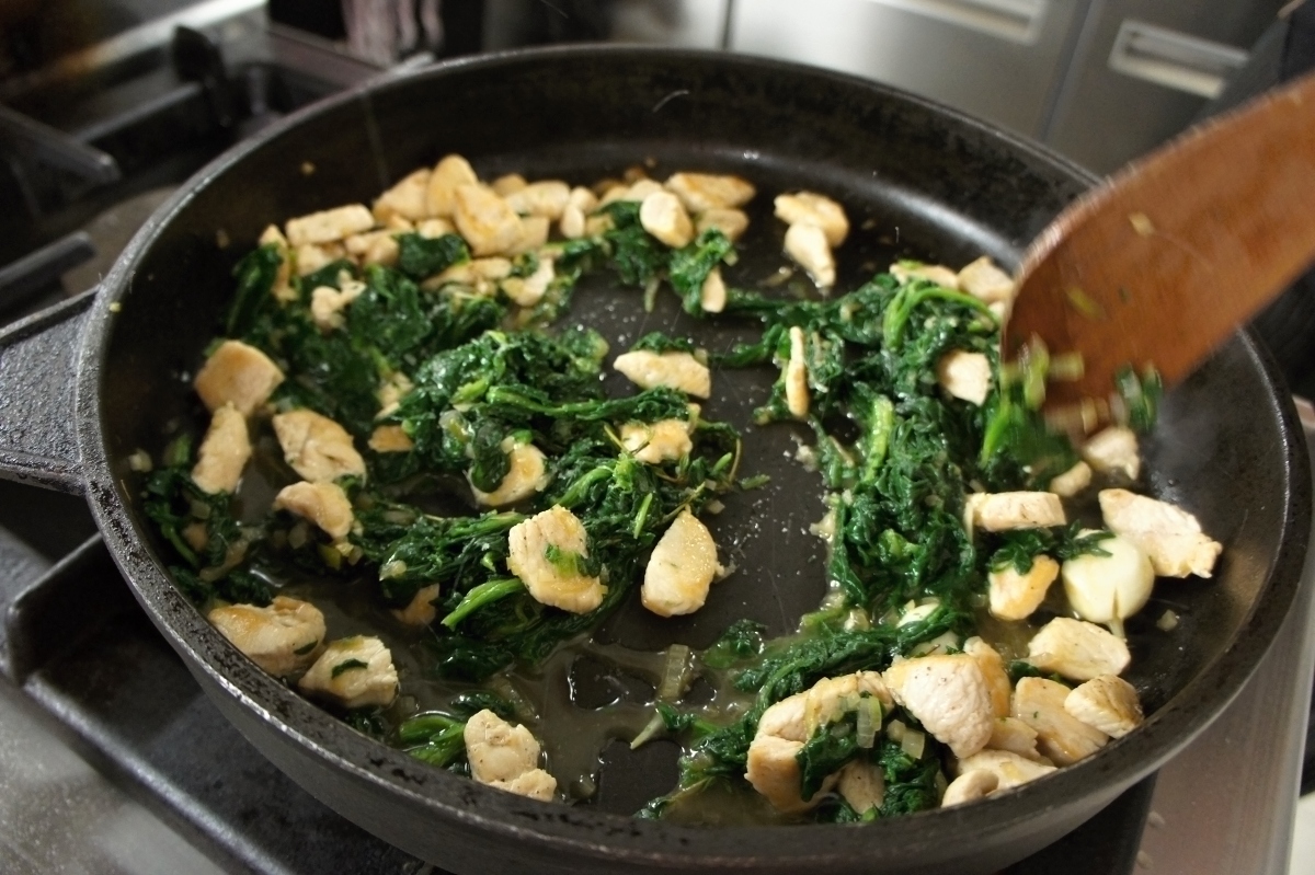 - Na pánvi osolíme, orestujeme a přidáme špenát.